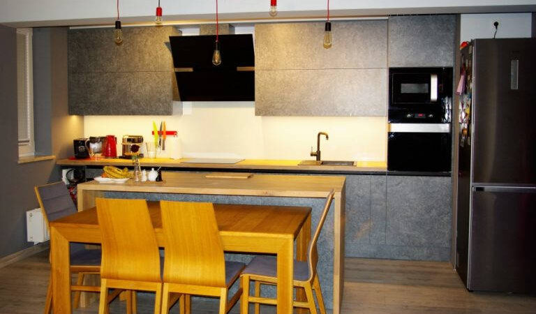 Popielata kuchnia z blatem laminowanym w kolorze dębu, która świetnie komponuje się z dębowym parkietem. Taka kuchnia łączy ze sobą funkcjonalność i prostotę, skromność i wygodę.