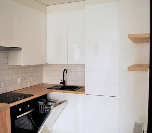 Kuchnia z białą połyskową taflą lakierowanych frontów. Połączenie imitacji białego muru i czarnego sprzętu AGD świetnie pasuje do minimalistycznego stylu tego pomieszczenia. Biała cegła i drewniany blat ocieplają wnętrze i nadają mu przytulności.